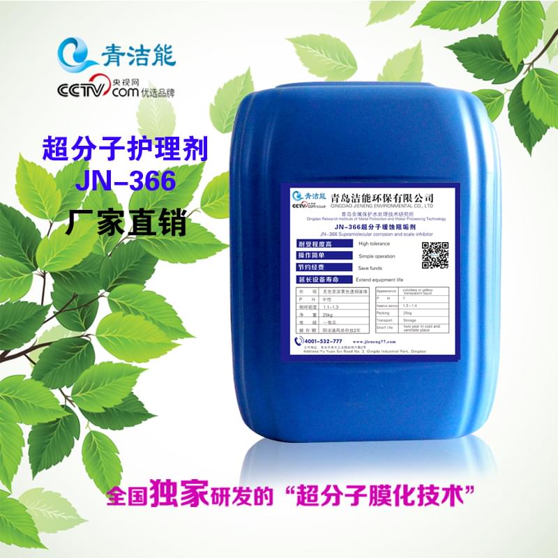 變傳統(tǒng)的水質(zhì)穩(wěn)定處理為金屬表面超分子膜化處理。形成的超分子膜,類似于自然界的荷葉表面效應(yīng),荷葉膜可以拒絕污染,防止腐蝕。JN-366超分子緩蝕阻垢劑性質(zhì)穩(wěn)定,可耐高PH值,高硬度,高濁度,有優(yōu)良性能,可使系統(tǒng)在自然PH值高濃縮倍數(shù)下運(yùn)行,對一般水質(zhì),K值可達(dá)10,是普通藥劑(K=2~3)節(jié)水量的3~5倍。既可以緩蝕,還可以分散阻垢,對碳酸鹽、磷酸鹽、硫酸鹽、硅鎂鹽垢等都具有優(yōu)良的阻垢性能。超分子概念是1987年法國化學(xué)家提出,我國水處理專家—韓泰清高工第一個把此原理引用到工業(yè)循環(huán)水防腐阻垢領(lǐng)域,并研制出世界領(lǐng)先的超分子緩蝕阻垢劑,JN-366超分子緩蝕阻垢劑可廣泛應(yīng)用于各種工業(yè)循環(huán)水系統(tǒng),和城市供熱水管網(wǎng)系統(tǒng),特別是供熱采暖水系統(tǒng)加上JN-366超分子緩蝕阻垢劑,確保供熱系統(tǒng)不腐蝕、不結(jié)垢,冬天開爐供熱,夏天也不需排水換水,換熱站也無需反復(fù)清洗,大大提高換熱效率和水的利用率,延長系統(tǒng)使用壽命2倍以上,節(jié)水、節(jié)材、節(jié)能,經(jīng)濟(jì)和環(huán)保效益巨大!
